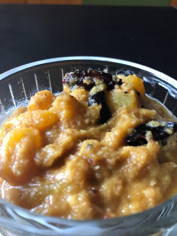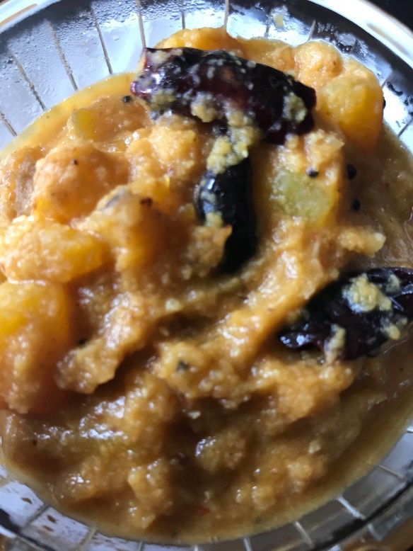 - When the pumpkin is cooked, add the dal and the coconut paste and water if needed to bring it to the thickness you desire. Check for seasoning at this point also.