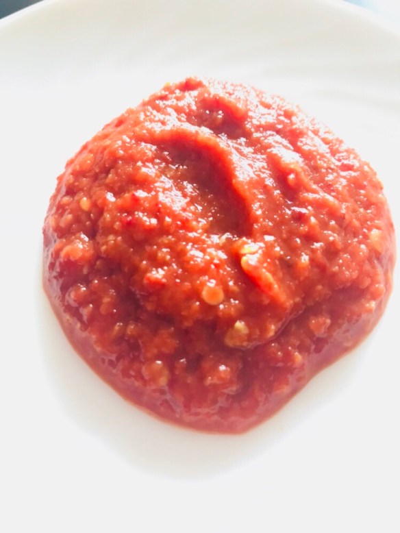 I made dosai (a South Indian crepe) earlier this week and wanted a chutney to go with it. I was not in the mood for a coconut based chutney which is what is traditionally made with dosai, so I thought of a dried red chilli one and whipped this up in less than 20 minutes, including prep time. It also has a total of five ingredients, including spices. So let’s go.