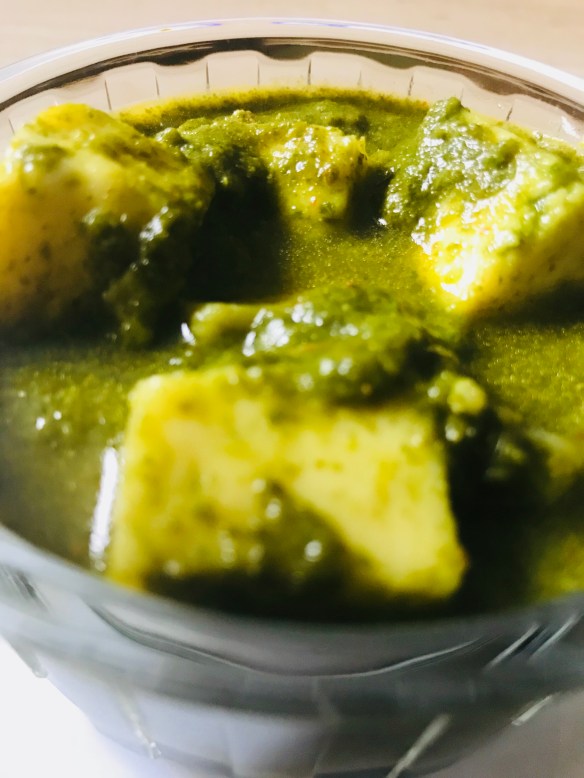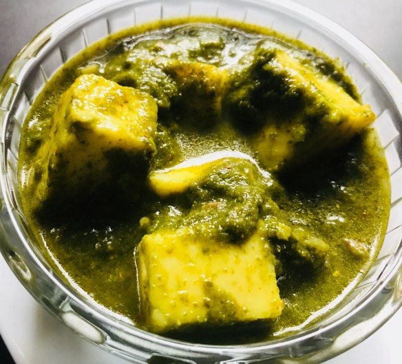 - Then add the spinach puree and let the palak cook well. When the spinach starts to bubble, add the paneer pieces and let it cook for a few more minutes.