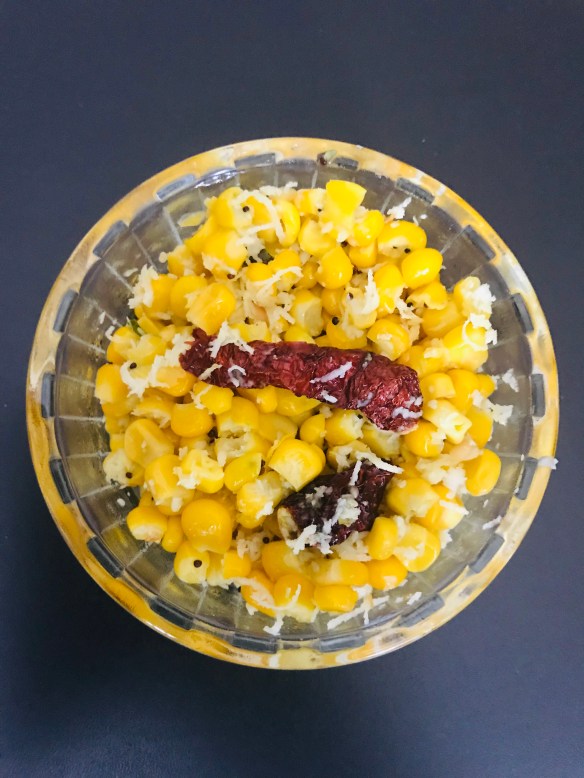 Another Navratri sundal recipe. This one came about serendipitously. I actually wanted to make something sweet that day but became late to make the offering so thought of making something with sweet corn. I made it like any sundal, but changed it up a bit. It also makes a very healthy salad or as a side for your main meal. S loved it so much that he made me make it again the next day.