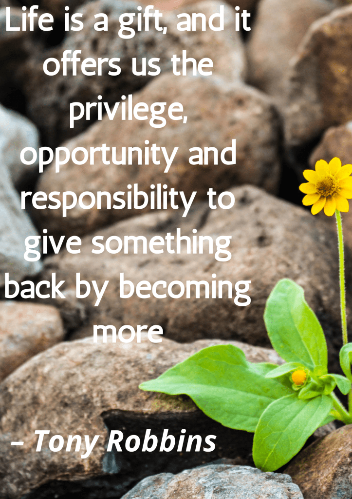 This week’s quote comes from the motivational speaker, Tony Robbins who said that life is a gift and this gift is a privilege and an opportunity and it is our responsibility to give back to this gift by becoming more than what we are today. That we should strive to become better versions of ourselves everyday is my take away from this quote.