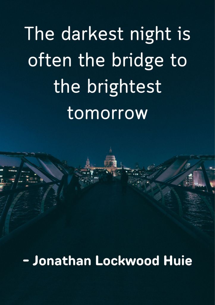 This quote from Jonathan Lockwood Huie, also known as the Philosopher of Happiness, reminds us to keep the faith and remain positive. When we are in pain and are riddled with self-doubt, it is easy to focus on the negatives and lose sight of the hope that is waiting for us just above the horizon. Difficulties may be overwhelming, but we should always remember that the darkest night is often the bridge to the brightest tomorrow.