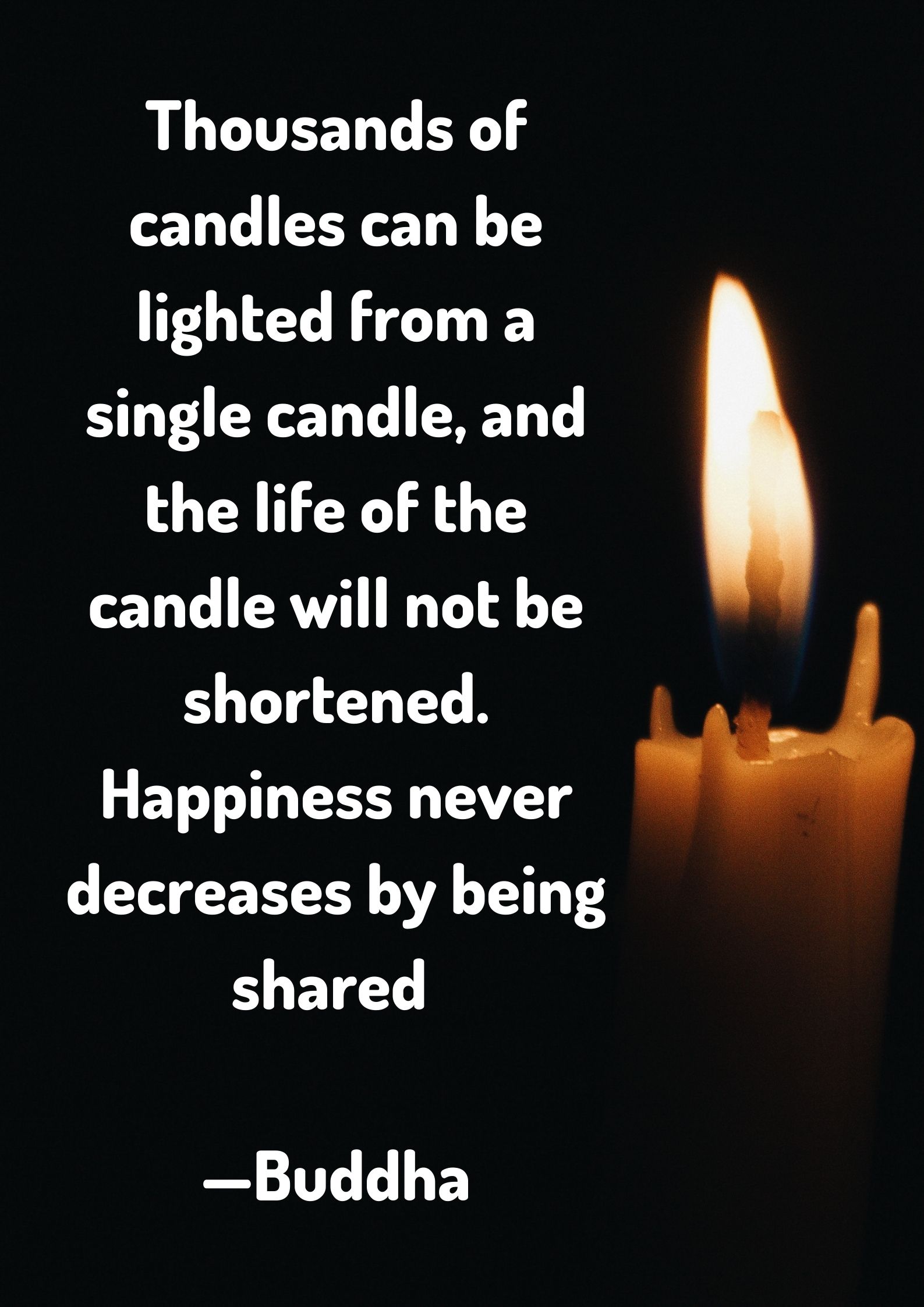 Today’s quote is from the Buddha. He tells us that thousands of candles can be lit from a single candle, and the life of the candle will not be shortened. Happiness never decreases by being shared. What this means is that when we share our happiness with others, our happiness will not reduce when we share our happiness, it shimmers around us and even multiplies when it is shared. So spread happiness all around you today, you will see how beautifully impacts your life.
