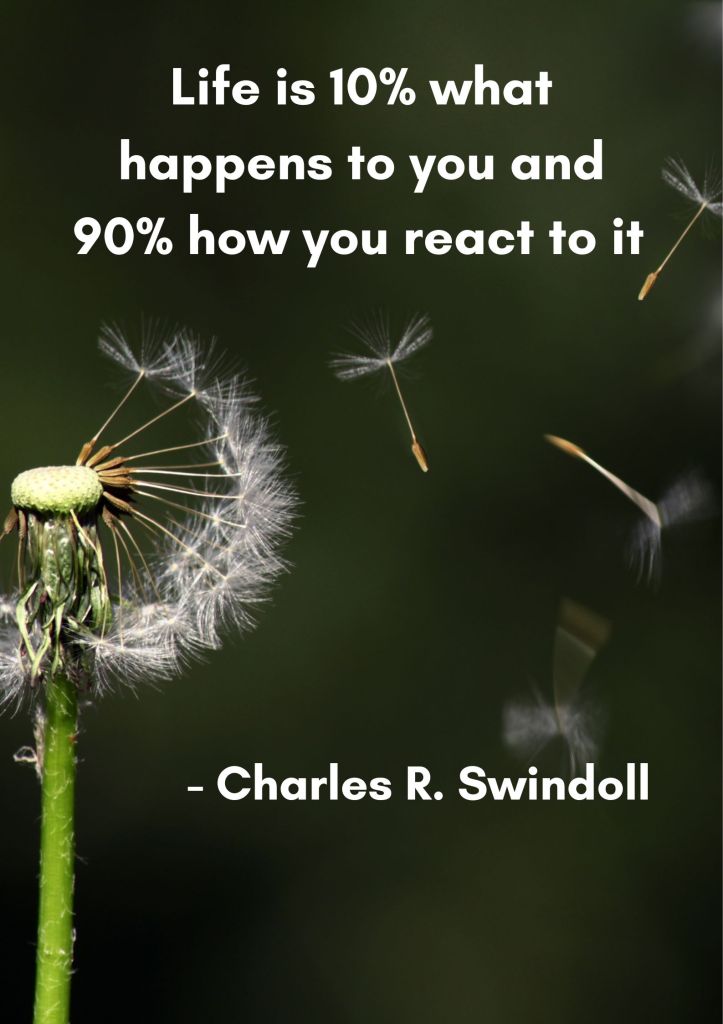 Today’s quote is credited to Charles R. Swindoll, an evangelical Christian pastor, author, educator, and radio preacher. He says that Life is 10% what happens to you and 90% how you react to it. What this means is that what happens is less important than our reaction to it. Reactions drive action and action defines the outcome, so ultimately our reaction is everything. No matter whether we succeed or fail, our reaction to both is what defines us. At the end of the day, we’re driven by our minds. How we perceive things determines our reactions to them. Ultimately, no one or nothing can make you happy or unhappy; it all depends on how we react. We are ultimately responsible for our reactions and actions. The way we feel and perceive things determines everything. Remember that nothing external can make you happy or sad unless you decide to do so yourself.