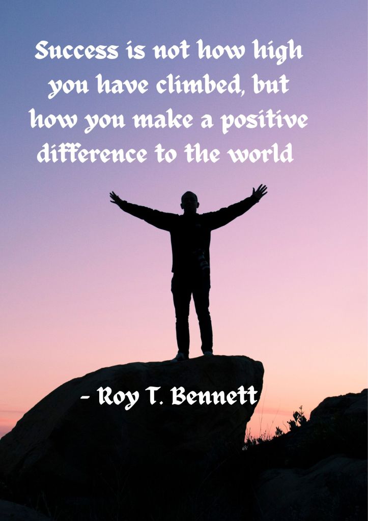 Our quote today is from motivational author and speaker Roy T. Bennett, who is known for his inspirational quotes and writings. His book, “The Light in the Heart,” is a collection of positive and uplifting messages that aim to inspire personal growth, happiness, and inner peace. The book encourages readers to reflect on their lives, pursue their dreams, and cultivate a positive mindset. Today’s quote emphasises that true success is not solely determined by the height of one’s achievements or the status one has attained but by the positive impact and contributions they have made to the world. Climbing to great heights in terms of wealth, power, or personal accomplishments is not enough if it does not bring about positive change or benefit others. An individual should use their abilities, influence, and resources to create a positive impact and contribute to the greater good, going beyond personal gain and focusing on making a meaningful difference in the world.
