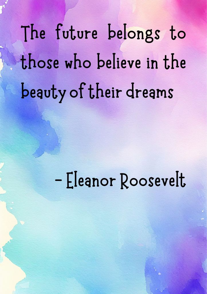 Former American first lady Eleanor Roosevelt’s quote emphasises the transformative power of having faith in one’s aspirations and the positive impact it can have on shaping the future. The quote underscores the importance of believing in and embracing one’s dreams and aspirations. It suggests that having confidence in the beauty, significance, and attainability of one’s dreams is a key factor in achieving them. It implies that individuals who cultivate an optimistic outlook toward their goals are more likely to take the necessary steps to turn those dreams into reality. By believing in the potential of their dreams, they contribute to the creation of a future that aligns with those aspirations. The quote’s core idea is that the future is not a predetermined outcome but is influenced and crafted by those who possess the belief and determination to bring their dreams to fruition.