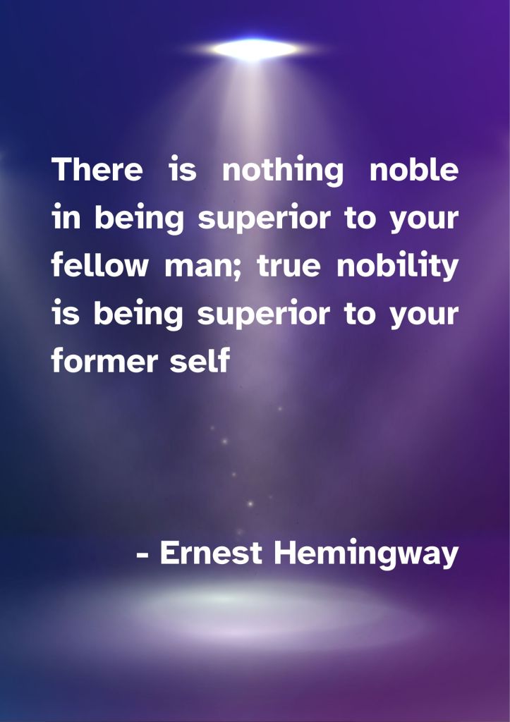 One of the most prominent literary figures of the 20th century, American novelist, short story writer, journalist, and Pulitzer and Nobel Prize winner, Ernest Hemingway’s quote emphasises the importance of personal growth and self-improvement over competing with others. Hemingway suggests that true nobility and worth are found in striving to improve oneself rather than in trying to be better than others. It encourages focusing on one’s development and progress. The quote underscores the value of self-reflection and continuous improvement. It implies that real success and honour come from overcoming one’s past limitations and becoming a better person than one was before. Hemingway’s words highlight the importance of intrinsic values and personal achievements, promoting the idea that self-betterment is a more virtuous goal than external recognition or superiority over others.