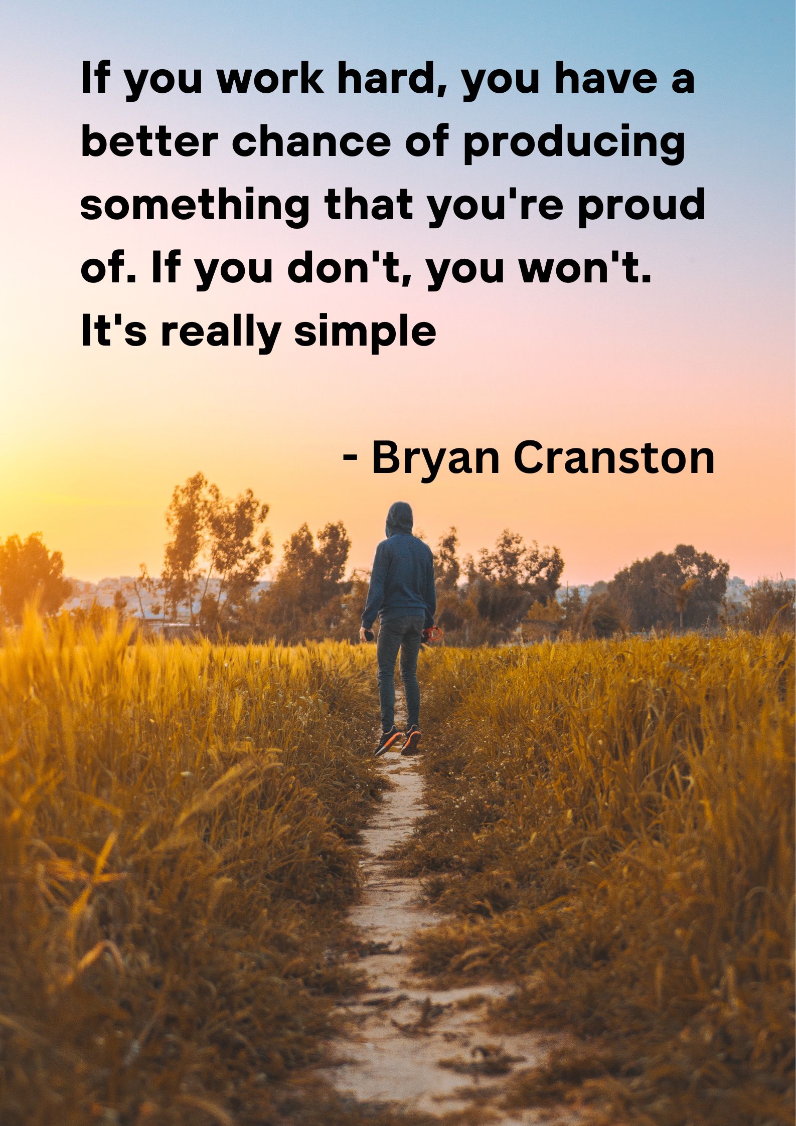 American actor, director, and producer best known for his roles in television series such as “Breaking Bad” and “Malcolm in the Middle, Bryan Cranston’s quote emphasises the direct correlation between effort and achievement. The quote underscores that hard work significantly increases the likelihood of achieving results that you can be proud of. It highlights the importance of putting in effort to reach your goals. Cranston points out a straightforward truth: without effort, the chances of success and personal satisfaction are minimal. The simplicity of the statement emphasises that success is often a result of consistent hard work. The quote also implies personal responsibility in achieving one’s goals. It suggests that individuals have control over their success through their dedication and work ethic.