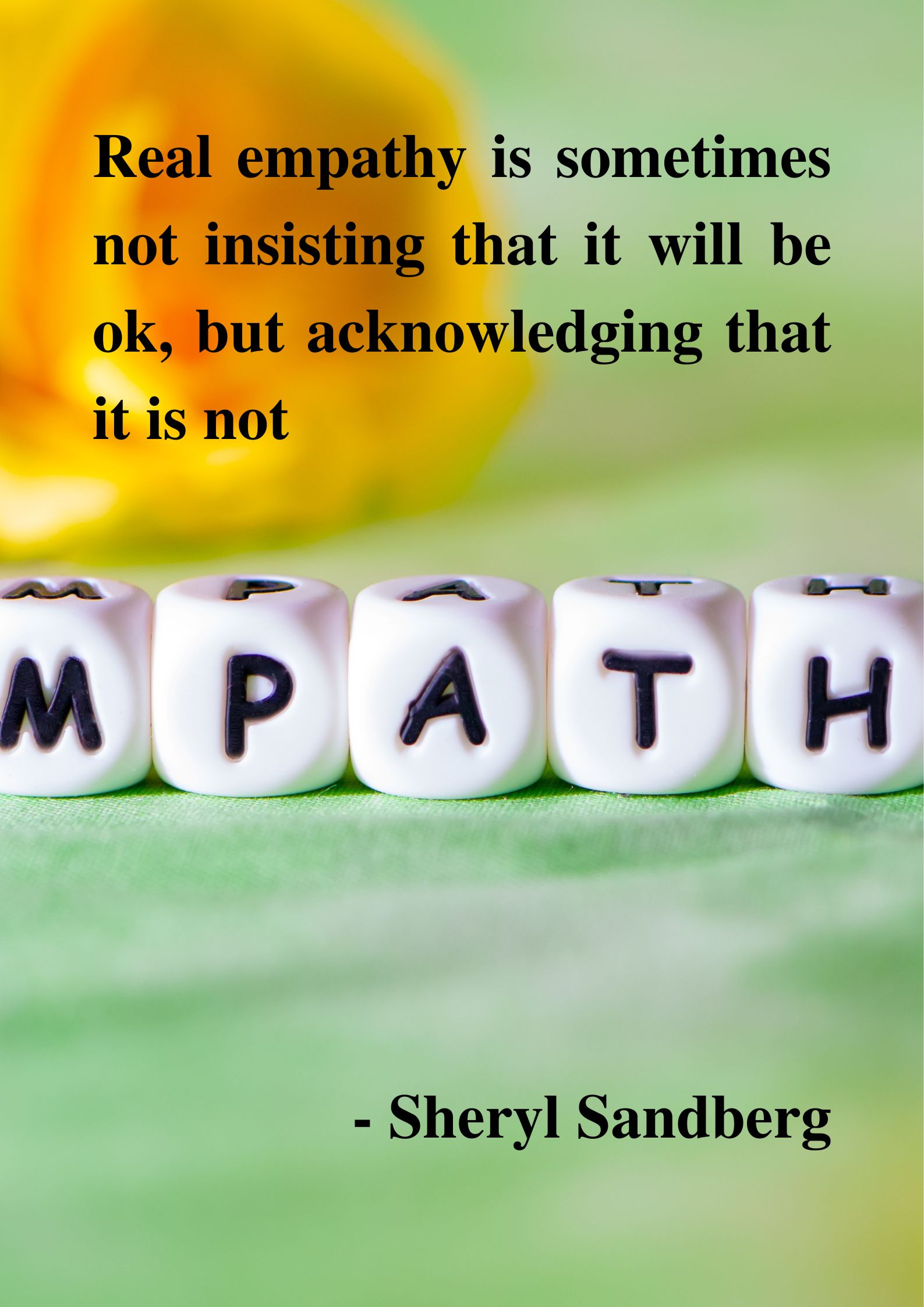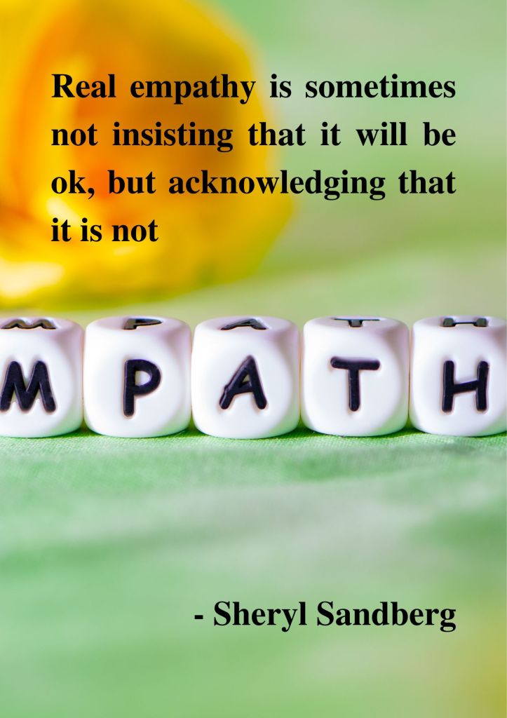 Sandberg’s quote sheds light on the true nature of empathy. She reminds us that empathy isn’t about offering quick reassurances or trying to “fix” someone’s pain. Often, the most compassionate response is simply to acknowledge the reality of someone’s suffering without minimising it. Telling someone “it will be okay” may unintentionally dismiss their feelings, while recognising that things are not okay validates their experience and makes them feel truly seen and supported. Real empathy is about presence, understanding, and acceptance, walking with someone in their pain rather than rushing them out of it.