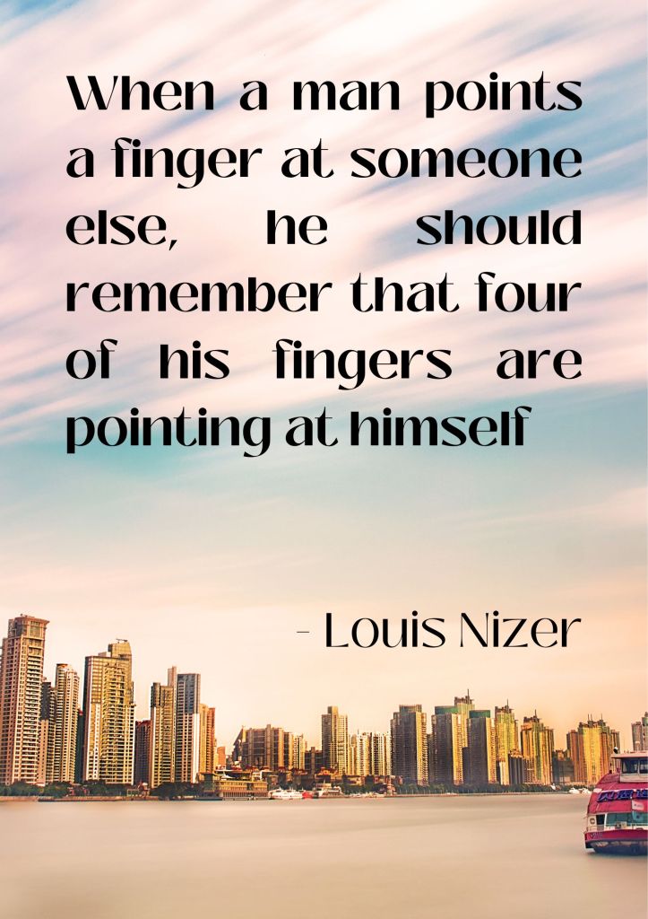 This quote from American trial lawyer, author, and lecturer known for his sharp intellect and eloquence, Louis Nizer, is a powerful reminder about self-reflection and accountability. It highlights how easy it is to criticise others while overlooking our own flaws or contributions to a problem. The image in the quote is simple but striking. When you point your index finger at someone, the other fingers naturally curl back toward your own hand. Nizer uses this physical gesture as a metaphor for human behaviour. Often, when we accuse, blame, or judge others, we forget to examine our own role in the situation. Our reactions, assumptions, and decisions may also have shaped the outcome.