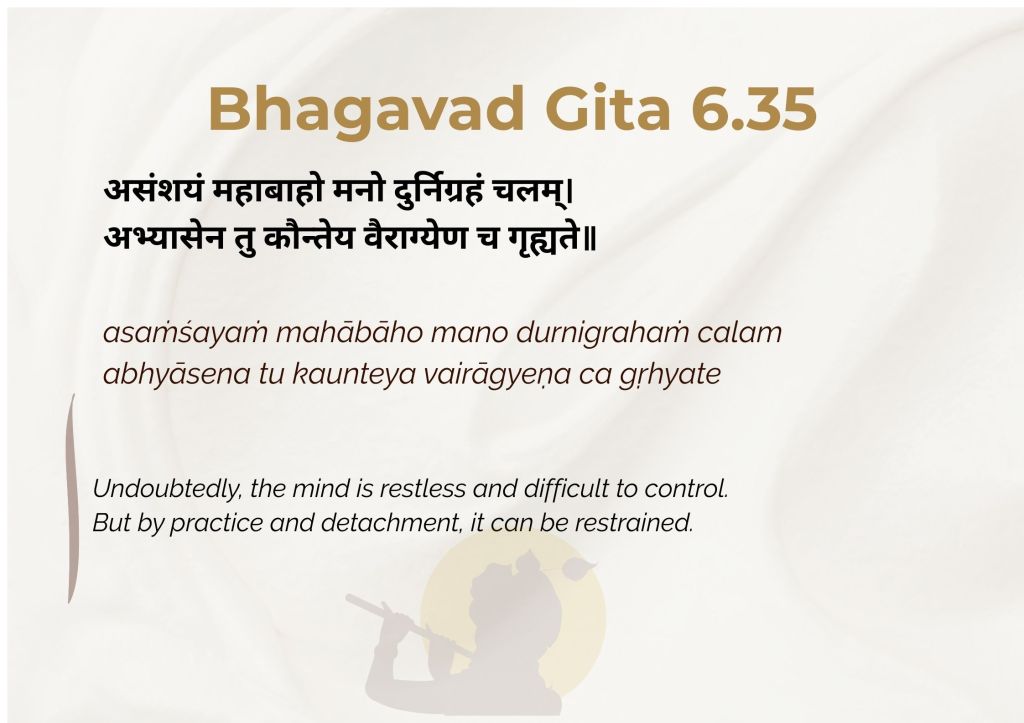 Today’s verse from the Bhagavad Gita acknowledges reality. The mind is restless. That is not a weakness. That is human. But it gives two tools: practice and detachment. Practice is repetition. Showing up again. Returning again. Detachment is loosening the grip. Not clinging to outcomes. Not over-identifying with thoughts. Together, they create steadiness. The month does not end in intensity; it ends in maturity. Not to fix the mind, but to train it patiently.