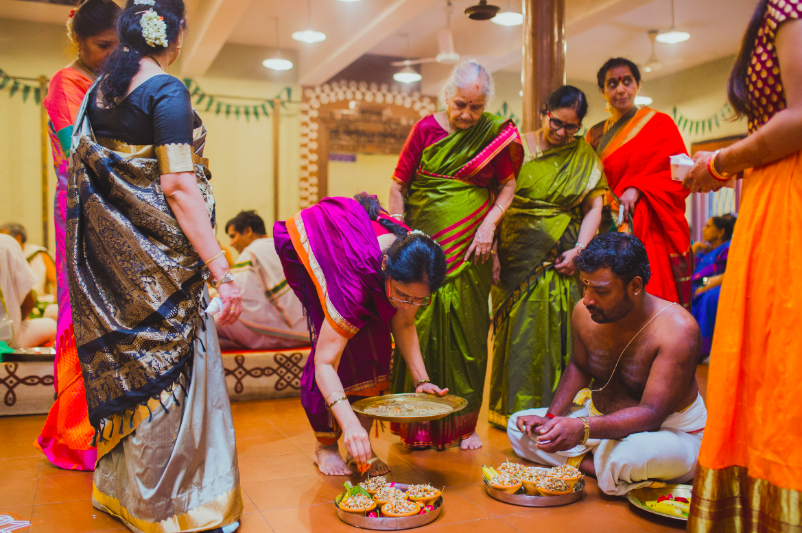 Sumangali Prarthanai: Sumangali Prarthanai is a prayer done by the married women invoking the blessings of female ancestors, who would have passed away as sumangalis, aka who died before their husbands. Sumangalis, who are invited, are supposed to represent the ancestral sumangalis and are worshipped and fed as per the customs and practices prevalent in individual families. Along with the sumangalis, a kanya or a young girl who has still not attained meranche is also worshipped and partakes in the feast. Usually, the sumangali prarthanai in the bride’s family is done before the wedding so that the daughter, who will be getting married, can be a part of the ceremony and receive blessings. In the case of the groom, it is done immediately after the wedding so that the new daughter-in-law can participate as a sumangali in this ritual. This ritual is usually done before any auspicious event in the family and I had done this before BB’s thread ceremony. Also, it can only be done once a year by a family as a whole, so for multiple weddings or other such ceremonies, only the first one will be counted.