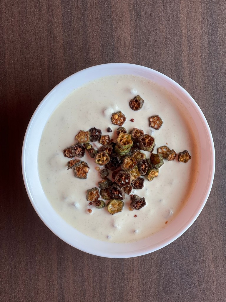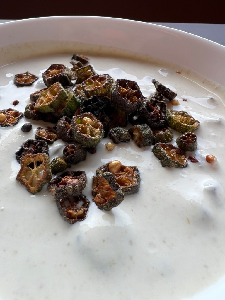 • Once the sautéed okra has cooled down and you are ready to serve the dish, gently fold the crisp bhindi into the yoghurt-coconut mixture.
