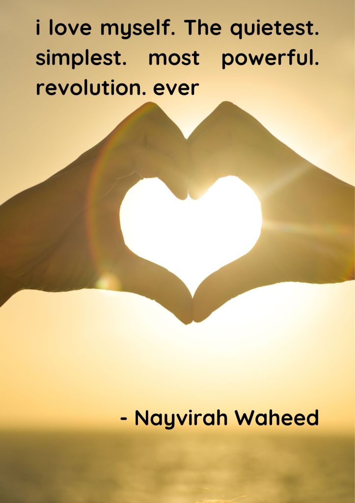 Waheed’s intentional use of lowercase letters and fragmented structure reflects the quiet, poetic rhythm of introspection. The quote is a reminder that the most profound changes often begin in the most intimate and internal spaces. Loving yourself is not ego, it is a revolution of acceptance, healing, and truth.