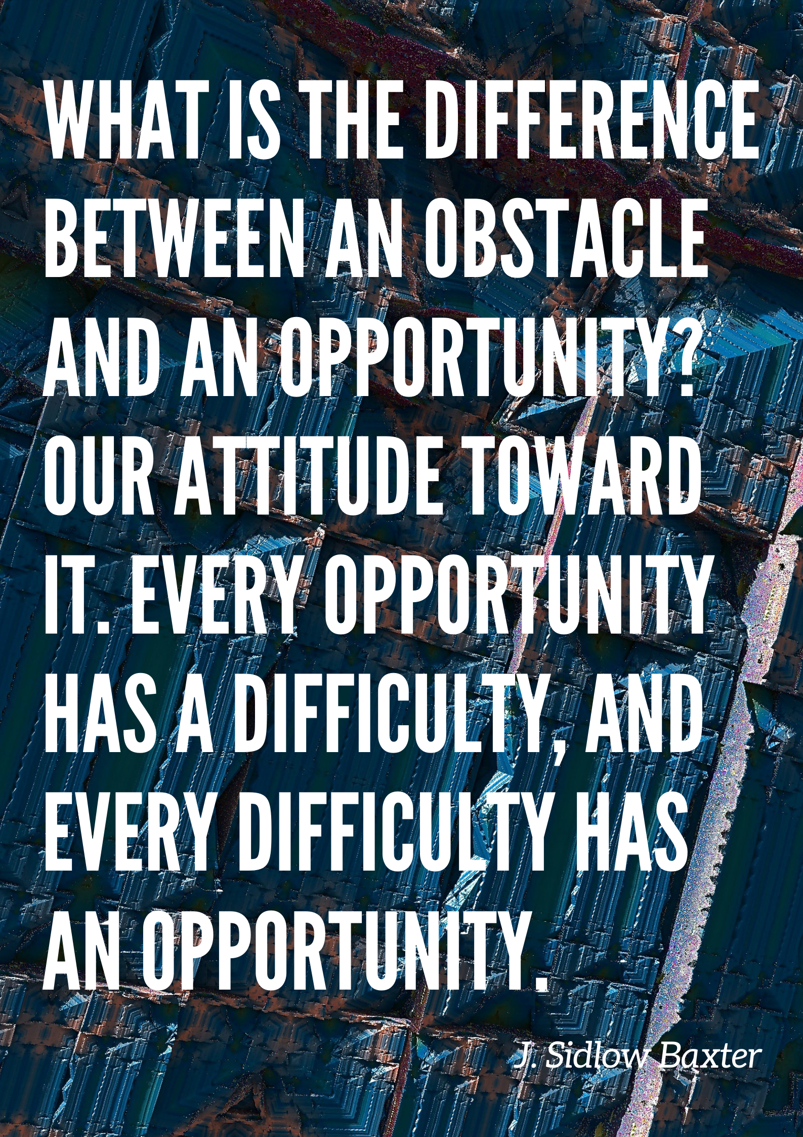 This week’s quote is about looking at an obstacle and not seeing it as a deterrent, but instead as an opportunity to show what you are made of and of converting that obstacle into an opportuntity and this boils down to your attitude. If you see a glass as half empty, you have a negative attitude and probably see it as something that will hinder progress, but if you see the glass as half empty, that you see things positively, then it’s a learning, even if it is an obstacle and you look at everything thing that happens in your life as a learning experience, be it positive or negative.