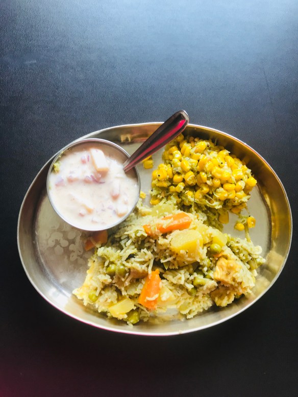 I served this with my Sweet Corn Sundal which I repurposed as a salad for today and a pineapple and onion raita.