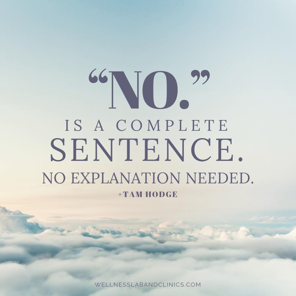 As if this was not enough, our culture places an unrealistic value on the pursuit of busyness. Society tells us that if we aren’t working on something, anything, we are just wasting time. Thus, if the reason we are saying no is so that we can find time to do something for ourselves or, perhaps, even manage to do nothing at all, we feel unworthy. And even when we finally muster up the courage to say no or I can’t, we then feel obligated to offer up an explanation to justify this unfavourable response. And this is why No is a complete sentence.