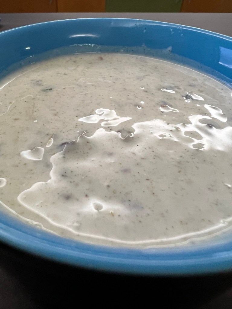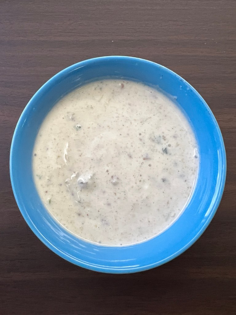 - In a mixing bowl, whisk the yoghurt until smooth. Add the coconut mixture to the yoghurt and mix well. Adjust salt to taste.