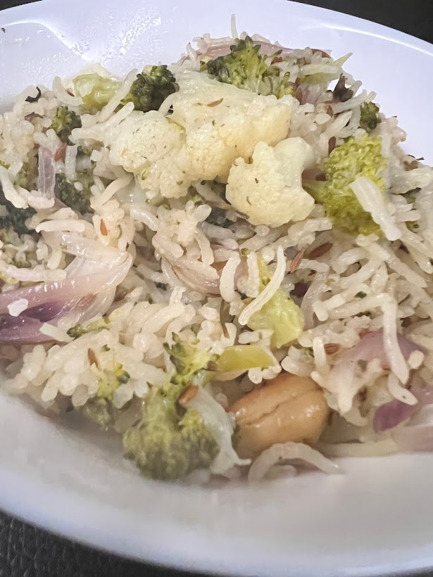 A couple of months back, while doomscrolling, I came across a similar recipe and knew I had to try it. Last week, I finally had a chance to make this. Combining the goodness of whole moong dal and mixed vegetables, this pulao is wholesome, flavourful and protein-packed and is ideal for a school or office lunchbox.