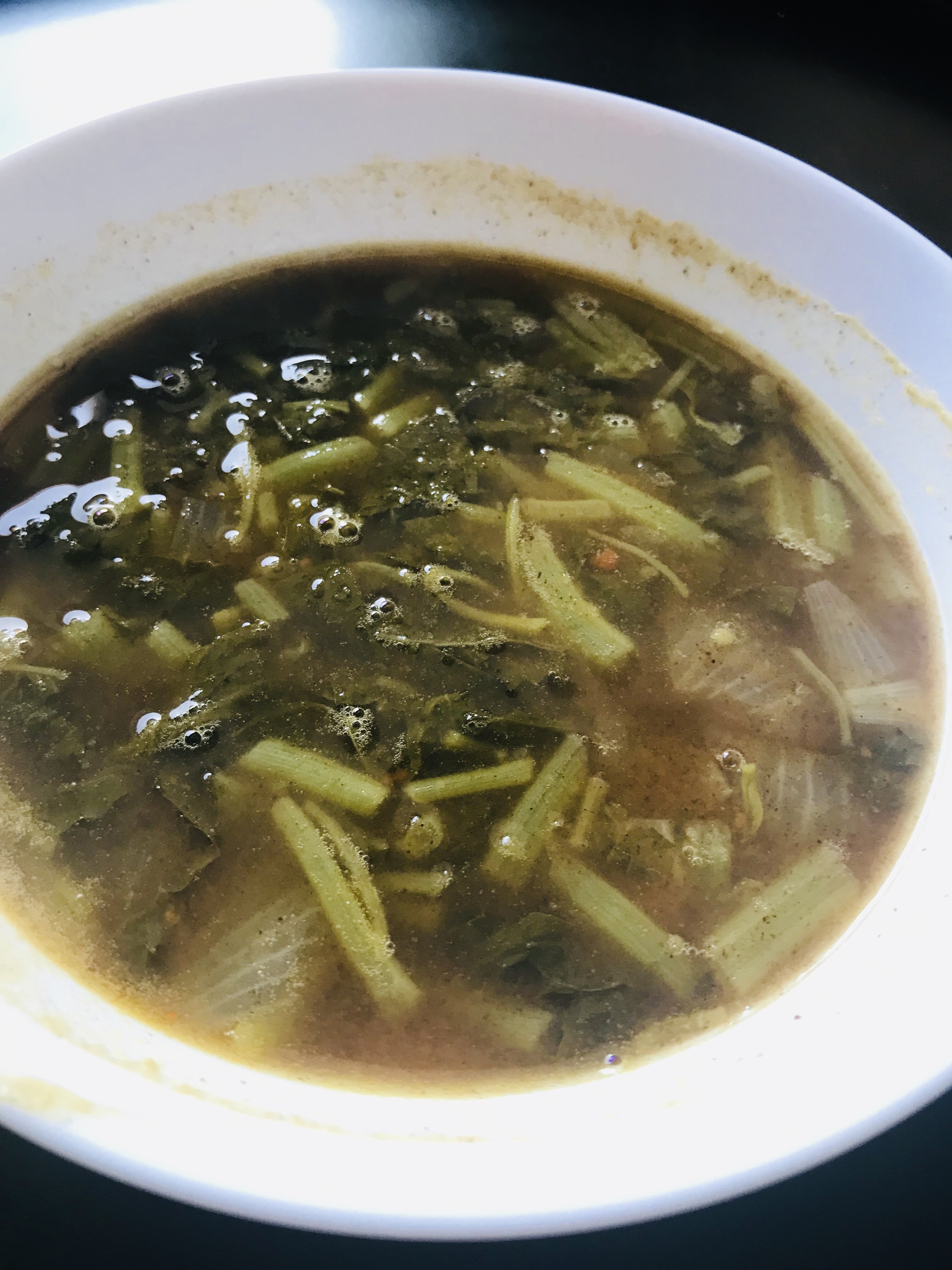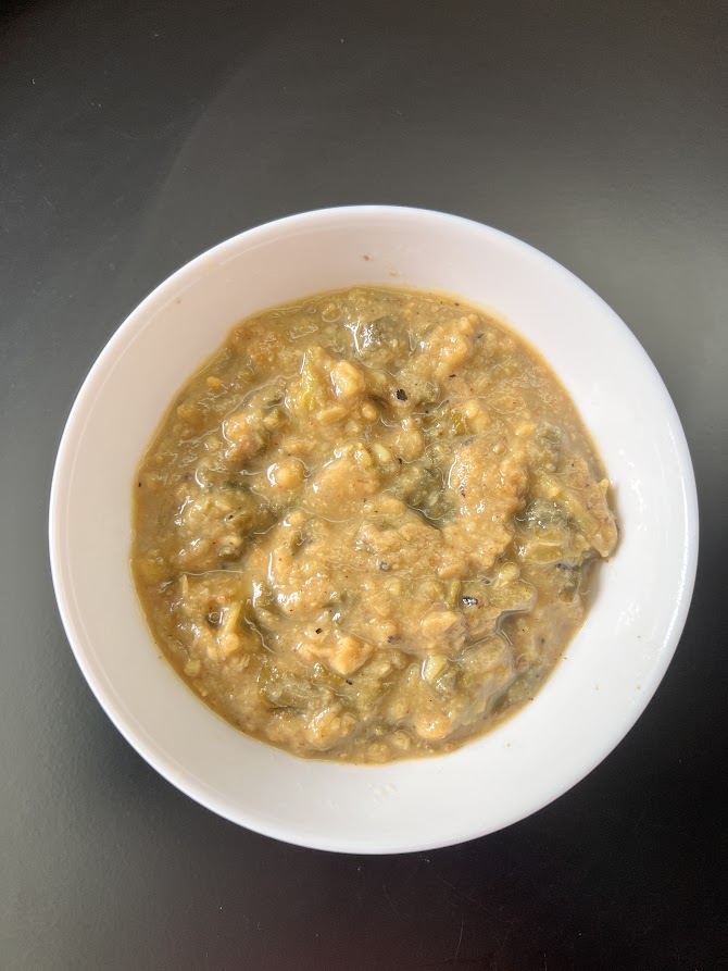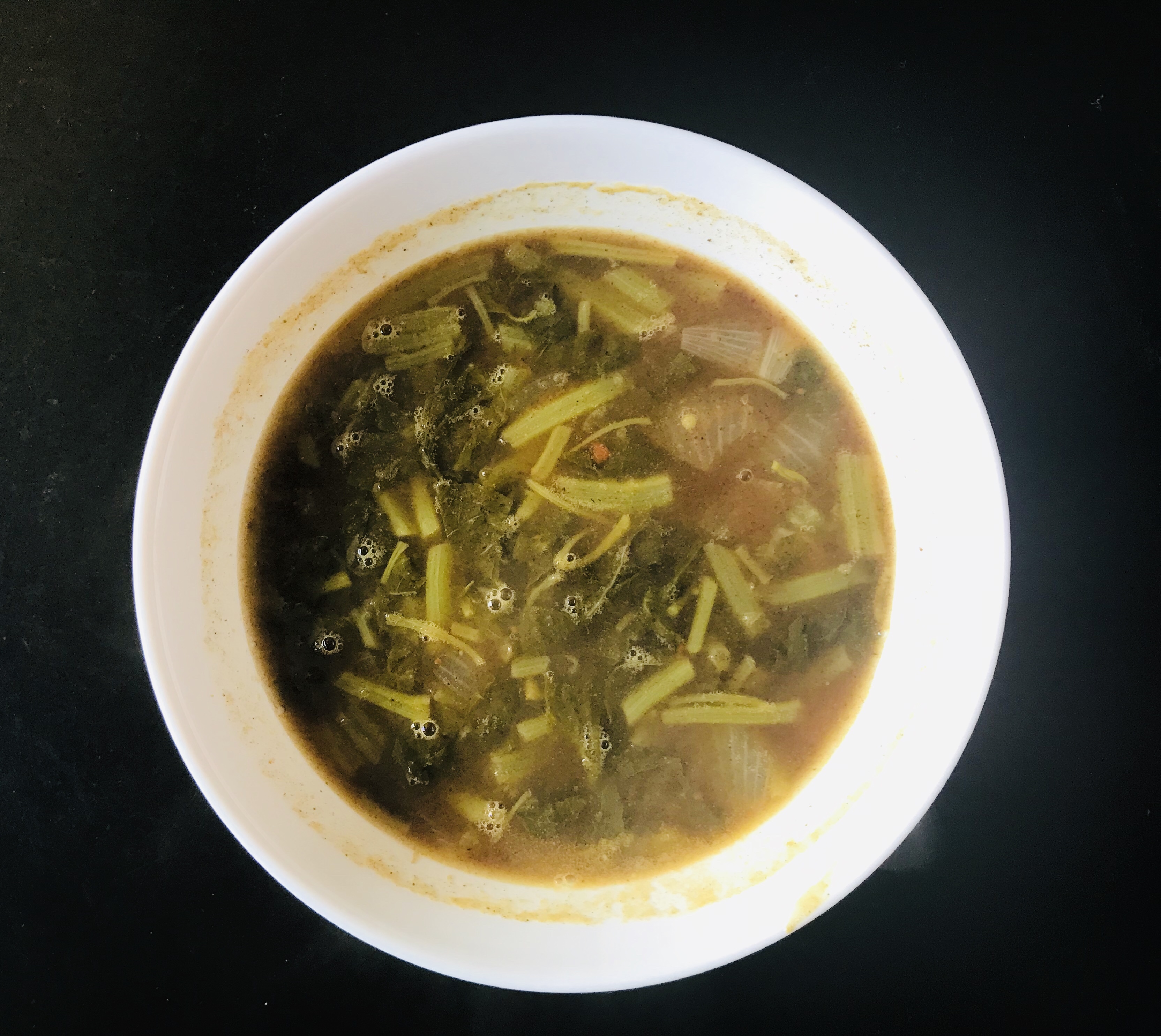 - Open the pressure cooker and mash the dal and greens together and switch on the flame again